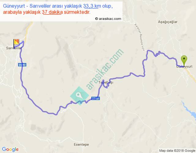 Güneyyurt - Sarıveliler arası yaklaşık olarak 90 km/h ile yukarıda belirtilen sürede olup, iki yerin kuş uçuşu uzaklığı (mesafesi) 17'dir. Yolculuk otobüsle 48 dakika sürmektedir.