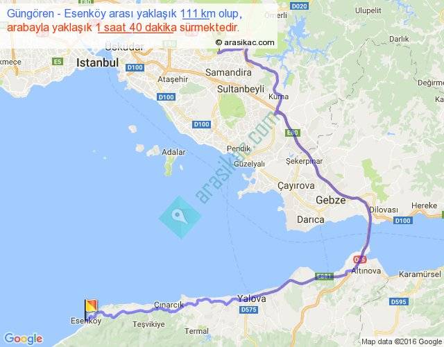 Güngören - Esenköy arası yaklaşık olarak 90 km/h ile yukarıda belirtilen sürede olup, iki yerin kuş uçuşu uzaklığı (mesafesi) 50'dir. Yolculuk otobüsle 2 saat 10 dakika sürmektedir.
