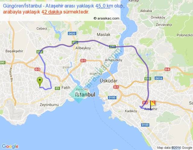 Güngören İstanbul - Ataşehir arası yaklaşık olarak 90 km/h ile yukarıda belirtilen sürede olup, iki yerin kuş uçuşu uzaklığı (mesafesi) 22'dir. Yolculuk otobüsle 58 dakika sürmektedir.