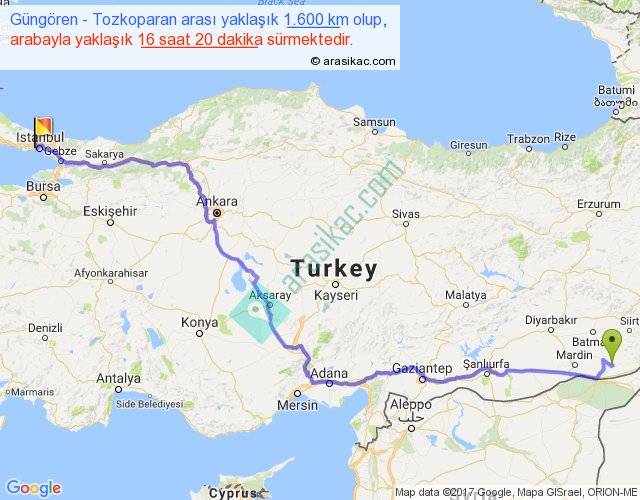 Güngören - Tozkoparan arası yaklaşık olarak 90 km/h ile yukarıda belirtilen sürede olup, iki yerin kuş uçuşu uzaklığı (mesafesi) 1158'dir. Eğer belirtilen yerler arasında uçak seferi var ise bu süre uçakla 1 saat 46 dakika'ya kadar düşebilir. Yolculuk otobüsle 21 saat 14 dakika sürmektedir.