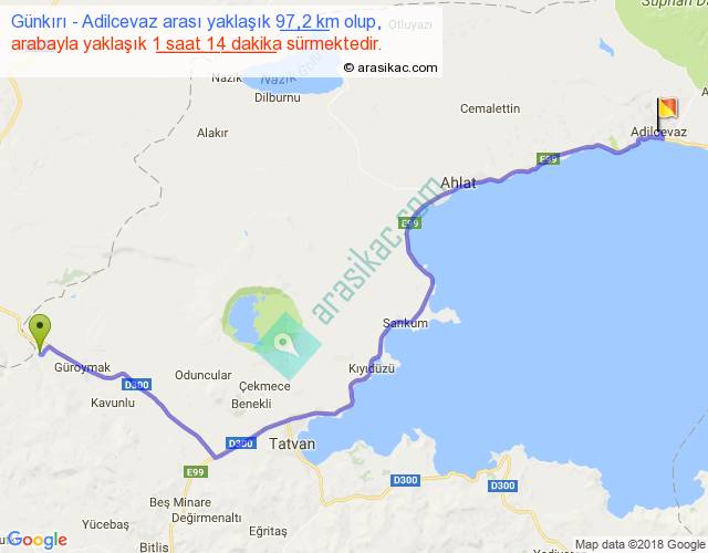 Günkırı - Adilcevaz arası yaklaşık olarak 90 km/h ile yukarıda belirtilen sürede olup, iki yerin kuş uçuşu uzaklığı (mesafesi) 71'dir. Yolculuk otobüsle 1 saat 36 dakika sürmektedir.