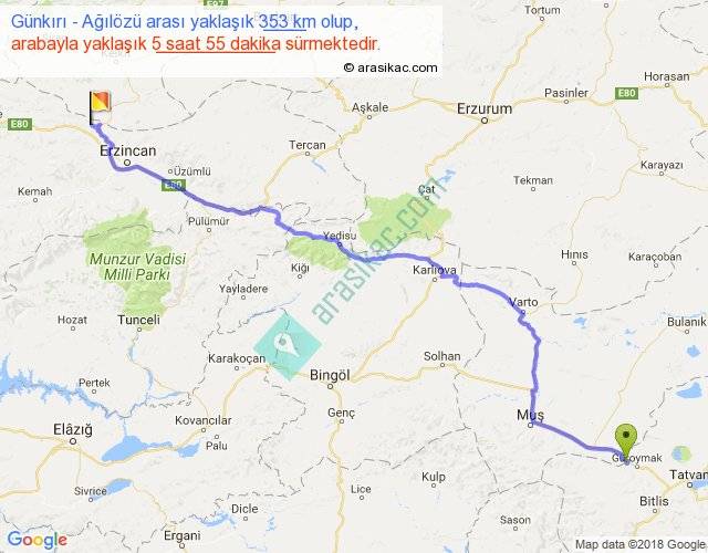 Günkırı - Ağılözü arası yaklaşık olarak 90 km/h ile yukarıda belirtilen sürede olup, iki yerin kuş uçuşu uzaklığı (mesafesi) 269'dir. Eğer belirtilen yerler arasında uçak seferi var ise bu süre uçakla 24 dakika'ya kadar düşebilir. Yolculuk otobüsle 7 saat 41 dakika sürmektedir.