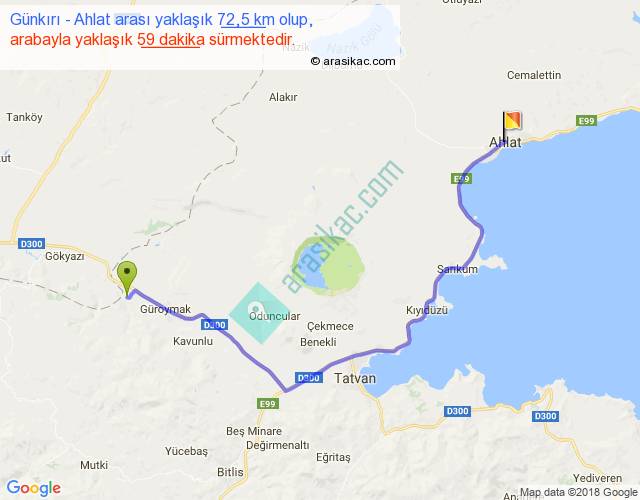 Günkırı - Ahlat arası yaklaşık olarak 90 km/h ile yukarıda belirtilen sürede olup, iki yerin kuş uçuşu uzaklığı (mesafesi) 48'dir. Yolculuk otobüsle 1 saat 16 dakika sürmektedir.