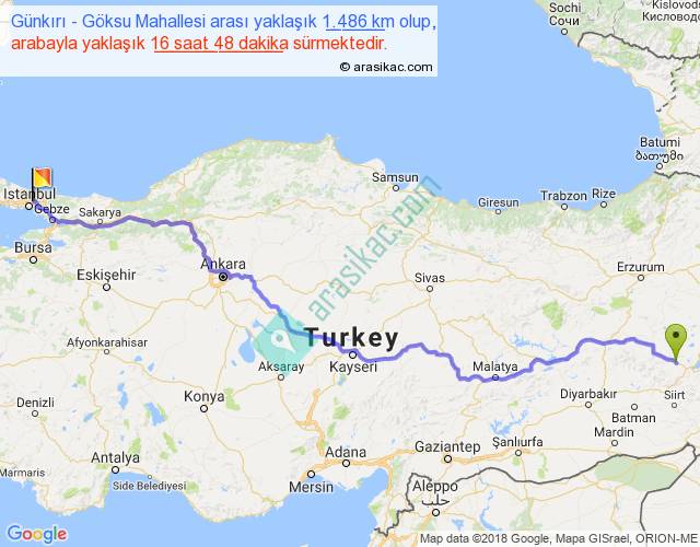 Günkırı - Göksu Mahallesi arası yaklaşık olarak 90 km/h ile yukarıda belirtilen sürede olup, iki yerin kuş uçuşu uzaklığı (mesafesi) 1128'dir. Eğer belirtilen yerler arasında uçak seferi var ise bu süre uçakla 1 saat 44 dakika'ya kadar düşebilir. Yolculuk otobüsle 21 saat 50 dakika sürmektedir.