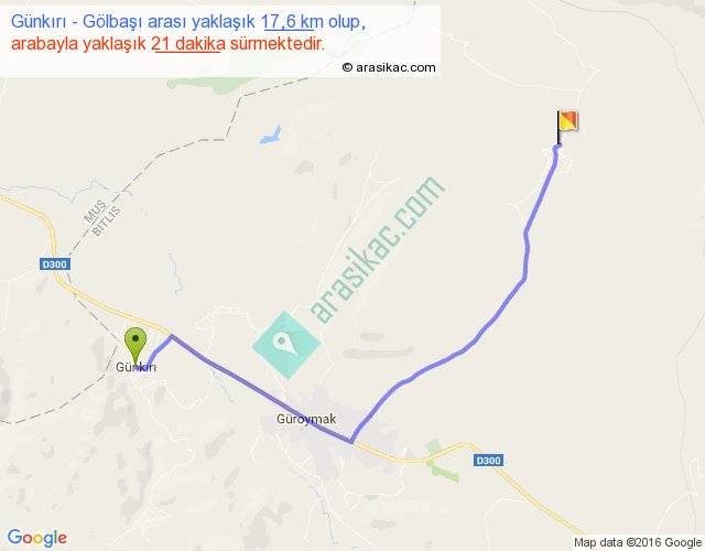 Günkırı - Gölbaşı arası yaklaşık olarak 90 km/h ile yukarıda belirtilen sürede olup, iki yerin kuş uçuşu uzaklığı (mesafesi) 13'dir. Yolculuk otobüsle 27 dakika sürmektedir.