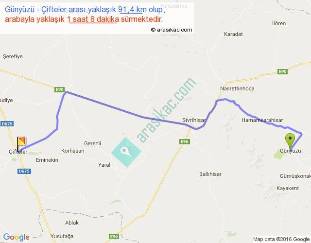 Günyüzü - Çifteler arası yaklaşık olarak 90 km/h ile yukarıda belirtilen sürede olup, iki yerin kuş uçuşu uzaklığı (mesafesi) 66'dir. Yolculuk otobüsle 1 saat 28 dakika sürmektedir.