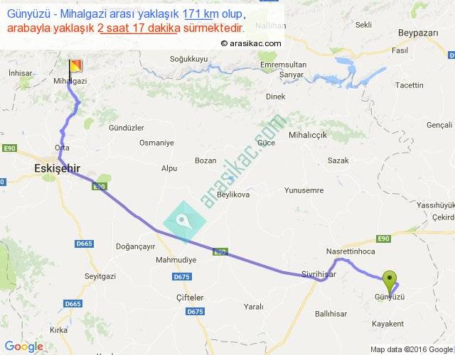 Günyüzü - Mihalgazi arası yaklaşık olarak 90 km/h ile yukarıda belirtilen sürede olup, iki yerin kuş uçuşu uzaklığı (mesafesi) 127'dir. Yolculuk otobüsle 2 saat 58 dakika sürmektedir.