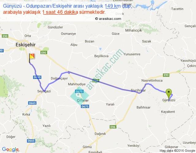 Günyüzü - Odunpazarı Eskişehir arası yaklaşık olarak 90 km/h ile yukarıda belirtilen sürede olup, iki yerin kuş uçuşu uzaklığı (mesafesi) 110'dir. Yolculuk otobüsle 2 saat 17 dakika sürmektedir.