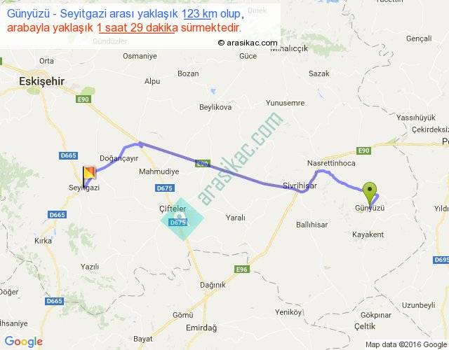 Günyüzü - Seyitgazi arası yaklaşık olarak 90 km/h ile yukarıda belirtilen sürede olup, iki yerin kuş uçuşu uzaklığı (mesafesi) 96'dir. Yolculuk otobüsle 1 saat 55 dakika sürmektedir.