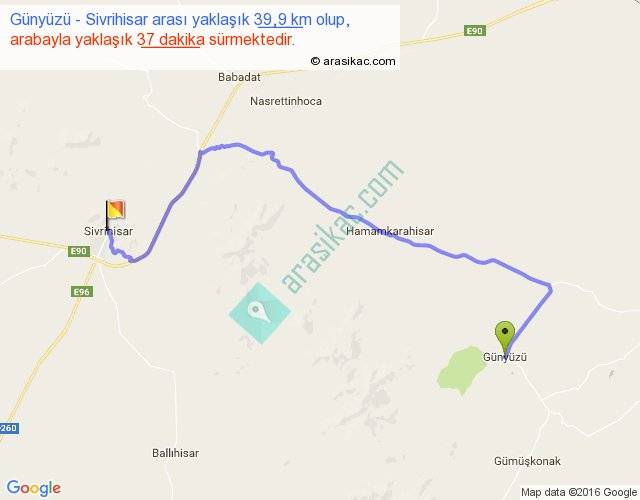 Günyüzü - Sivrihisar arası yaklaşık olarak 90 km/h ile yukarıda belirtilen sürede olup, iki yerin kuş uçuşu uzaklığı (mesafesi) 24'dir. Yolculuk otobüsle 48 dakika sürmektedir.