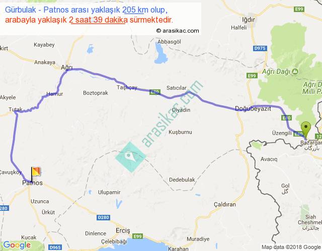 Gürbulak - Patnos arası yaklaşık olarak 90 km/h ile yukarıda belirtilen sürede olup, iki yerin kuş uçuşu uzaklığı (mesafesi) 129'dir. Yolculuk otobüsle 3 saat 26 dakika sürmektedir.