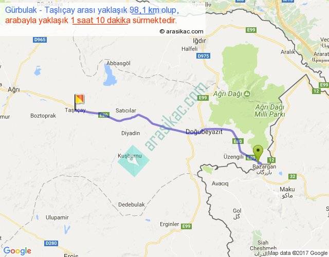 Gürbulak - Taşlıçay arası yaklaşık olarak 90 km/h ile yukarıda belirtilen sürede olup, iki yerin kuş uçuşu uzaklığı (mesafesi) 87'dir. Yolculuk otobüsle 1 saat 31 dakika sürmektedir.