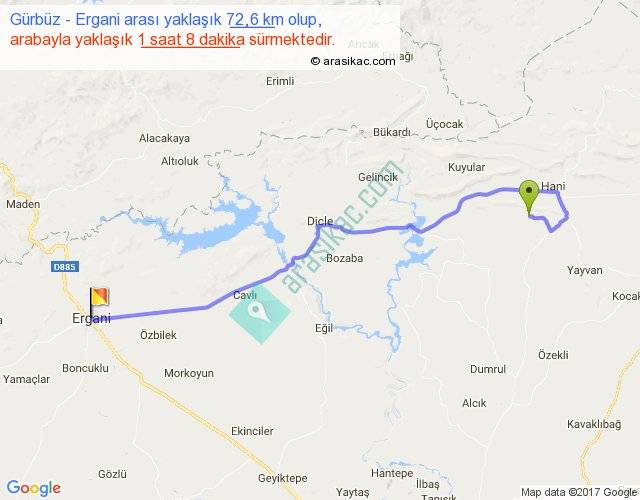 Gürbüz - Ergani arası yaklaşık olarak 90 km/h ile yukarıda belirtilen sürede olup, iki yerin kuş uçuşu uzaklığı (mesafesi) 54'dir. Yolculuk otobüsle 1 saat 28 dakika sürmektedir.