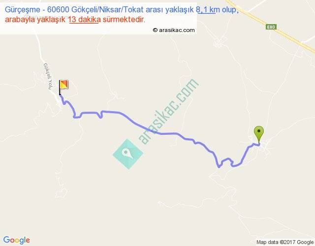 Gürçeşme - 60600 Gökçeli Niksar Tokat arası yaklaşık olarak 90 km/h ile yukarıda belirtilen sürede olup, iki yerin kuş uçuşu uzaklığı (mesafesi) 6'dir. Yolculuk otobüsle 16 dakika sürmektedir.