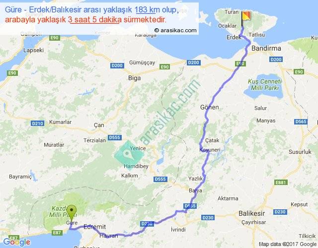 Güre - Erdek Balıkesir arası yaklaşık olarak 90 km/h ile yukarıda belirtilen sürede olup, iki yerin kuş uçuşu uzaklığı (mesafesi) 122'dir. Yolculuk otobüsle 4 saat 0 dakika sürmektedir.