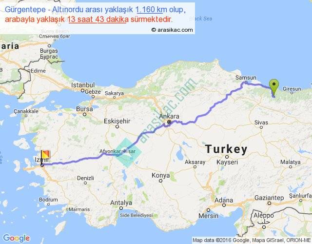 Gürgentepe - Altınordu arası yaklaşık olarak 90 km/h ile yukarıda belirtilen sürede olup, iki yerin kuş uçuşu uzaklığı (mesafesi) 928'dir. Eğer belirtilen yerler arasında uçak seferi var ise bu süre uçakla 1 saat 25 dakika'ya kadar düşebilir. Yolculuk otobüsle 17 saat 49 dakika sürmektedir.