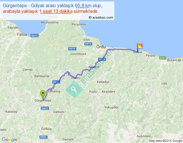 Gürgentepe - Gülyalı arası yaklaşık olarak 90 km/h ile yukarıda belirtilen sürede olup, iki yerin kuş uçuşu uzaklığı (mesafesi) 43'dir. Yolculuk otobüsle 1 saat 34 dakika sürmektedir.