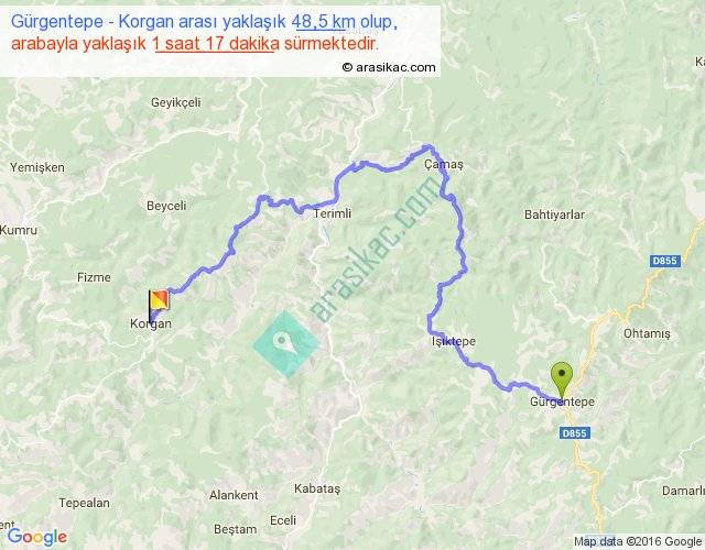 Gürgentepe - Korgan arası yaklaşık olarak 90 km/h ile yukarıda belirtilen sürede olup, iki yerin kuş uçuşu uzaklığı (mesafesi) 22'dir. Yolculuk otobüsle 1 saat 40 dakika sürmektedir.