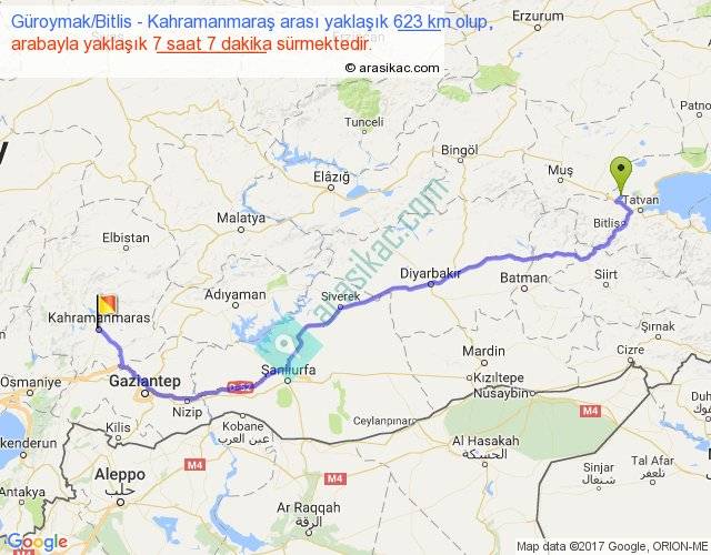 Güroymak Bitlis - Kahramanmaraş arası yaklaşık olarak 90 km/h ile yukarıda belirtilen sürede olup, iki yerin kuş uçuşu uzaklığı (mesafesi) 464'dir. Eğer belirtilen yerler arasında uçak seferi var ise bu süre uçakla 42 dakika'ya kadar düşebilir. Yolculuk otobüsle 9 saat 15 dakika sürmektedir.