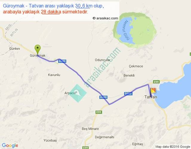 Güroymak - Tatvan arası yaklaşık olarak 90 km/h ile yukarıda belirtilen sürede olup, iki yerin kuş uçuşu uzaklığı (mesafesi) 24'dir. Yolculuk otobüsle 36 dakika sürmektedir.