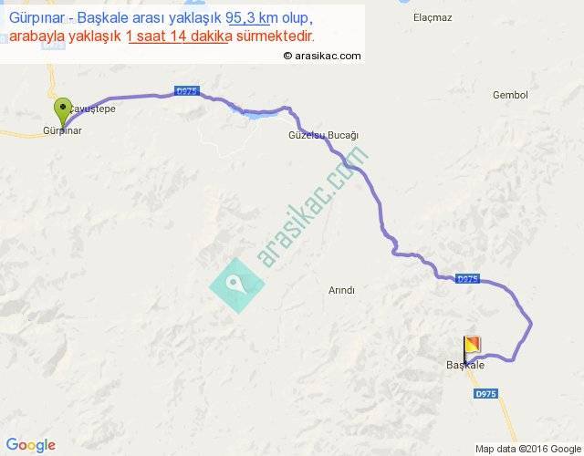 Gürpınar - Başkale arası yaklaşık olarak 90 km/h ile yukarıda belirtilen sürede olup, iki yerin kuş uçuşu uzaklığı (mesafesi) 61'dir. Yolculuk otobüsle 1 saat 36 dakika sürmektedir.