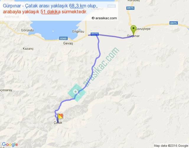 Gürpınar - Çatak arası yaklaşık olarak 90 km/h ile yukarıda belirtilen sürede olup, iki yerin kuş uçuşu uzaklığı (mesafesi) 46'dir. Yolculuk otobüsle 1 saat 6 dakika sürmektedir.
