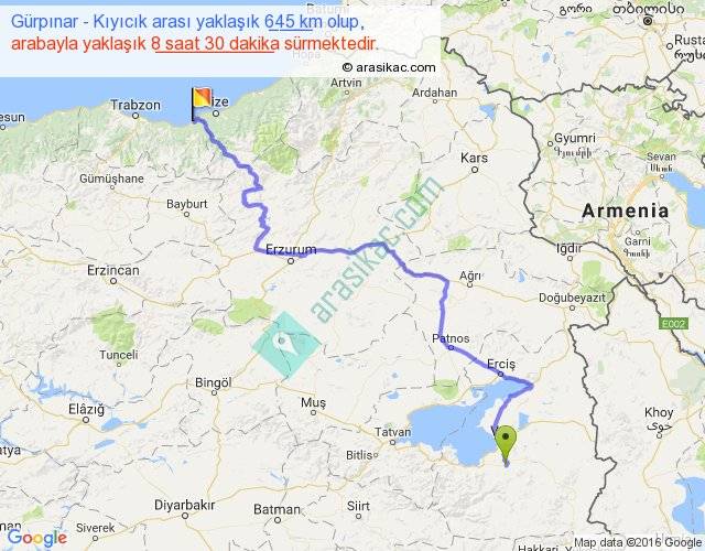 Gürpınar - Kıyıcık arası yaklaşık olarak 90 km/h ile yukarıda belirtilen sürede olup, iki yerin kuş uçuşu uzaklığı (mesafesi) 394'dir. Eğer belirtilen yerler arasında uçak seferi var ise bu süre uçakla 36 dakika'ya kadar düşebilir. Yolculuk otobüsle 11 saat 3 dakika sürmektedir.