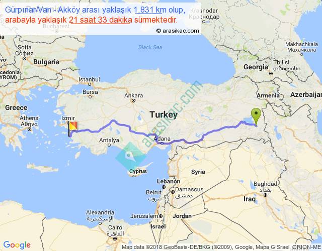 Gürpınar Van - Akköy arası yaklaşık olarak 90 km/h ile yukarıda belirtilen sürede olup, iki yerin kuş uçuşu uzaklığı (mesafesi) 1423'dir. Eğer belirtilen yerler arasında uçak seferi var ise bu süre uçakla 2 saat 11 dakika'ya kadar düşebilir. Yolculuk otobüsle 1 gün 4 saat sürmektedir.
