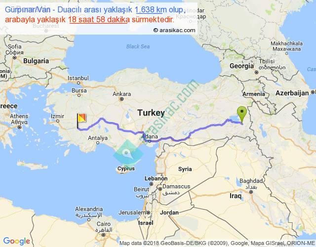 Gürpınar Van - Duacılı arası yaklaşık olarak 90 km/h ile yukarıda belirtilen sürede olup, iki yerin kuş uçuşu uzaklığı (mesafesi) 1271'dir. Eğer belirtilen yerler arasında uçak seferi var ise bu süre uçakla 1 saat 57 dakika'ya kadar düşebilir. Yolculuk otobüsle 1 gün 0 saat sürmektedir.