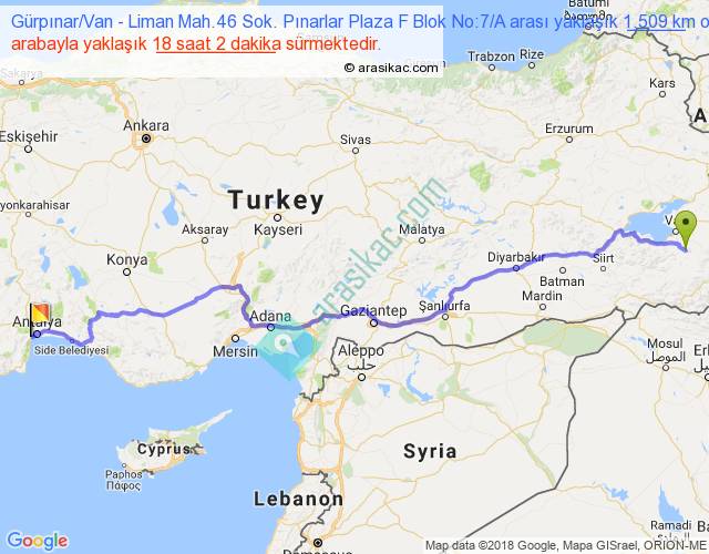 Gürpınar Van - Liman Mah.46 Sok. Pınarlar Plaza F Blok No:7 A arası yaklaşık olarak 90 km/h ile yukarıda belirtilen sürede olup, iki yerin kuş uçuşu uzaklığı (mesafesi) 1144'dir. Eğer belirtilen yerler arasında uçak seferi var ise bu süre uçakla 1 saat 45 dakika'ya kadar düşebilir. Yolculuk otobüsle 23 saat 26 dakika sürmektedir.