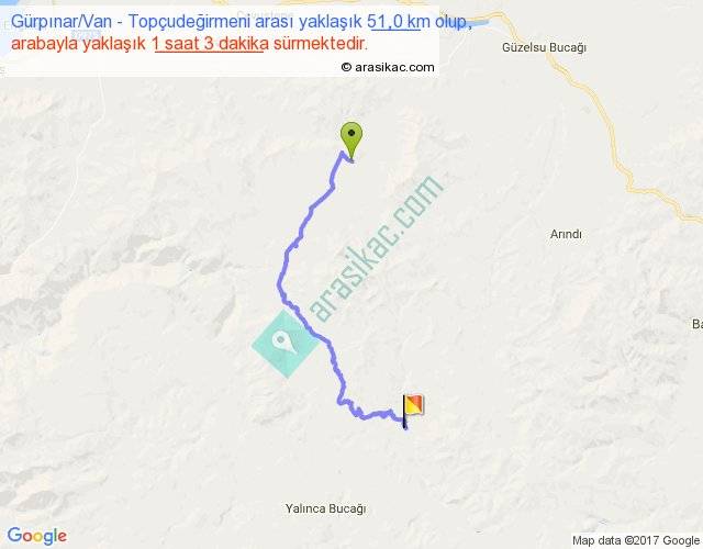 Gürpınar Van - Topçudeğirmeni arası yaklaşık olarak 90 km/h ile yukarıda belirtilen sürede olup, iki yerin kuş uçuşu uzaklığı (mesafesi) 30'dir. Yolculuk otobüsle 1 saat 21 dakika sürmektedir.