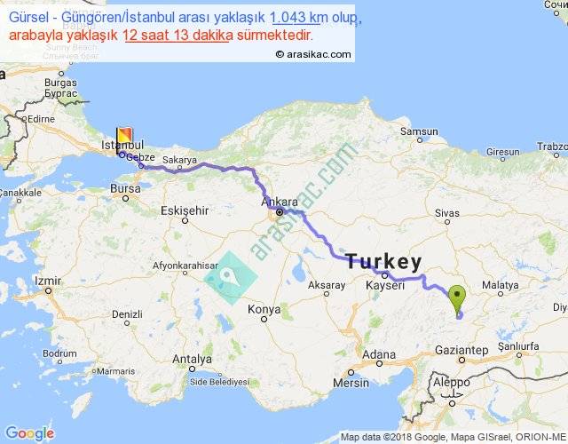 Gürsel - Güngören İstanbul arası yaklaşık olarak 90 km/h ile yukarıda belirtilen sürede olup, iki yerin kuş uçuşu uzaklığı (mesafesi) 794'dir. Eğer belirtilen yerler arasında uçak seferi var ise bu süre uçakla 1 saat 13 dakika'ya kadar düşebilir. Yolculuk otobüsle 15 saat 52 dakika sürmektedir.