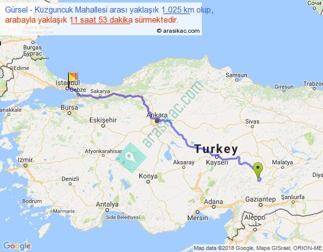 Gürsel - Kuzguncuk Mahallesi arası yaklaşık olarak 90 km/h ile yukarıda belirtilen sürede olup, iki yerin kuş uçuşu uzaklığı (mesafesi) 783'dir. Eğer belirtilen yerler arasında uçak seferi var ise bu süre uçakla 1 saat 12 dakika'ya kadar düşebilir. Yolculuk otobüsle 15 saat 26 dakika sürmektedir.