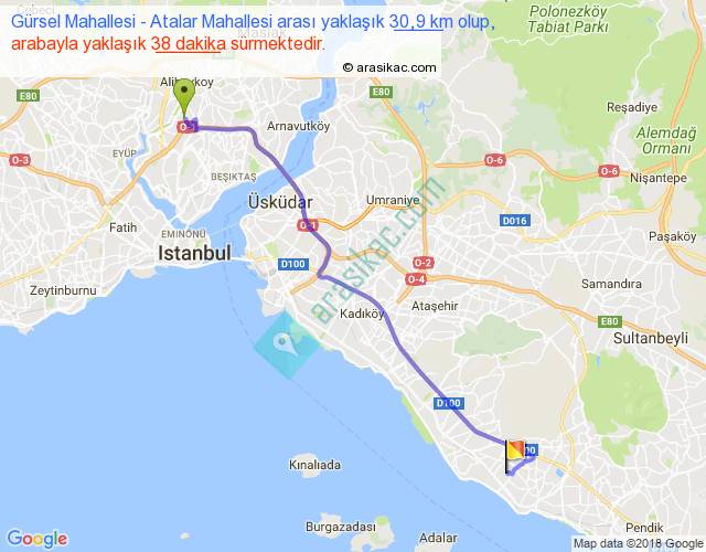 Gürsel Mahallesi - Atalar Mahallesi arası yaklaşık olarak 90 km/h ile yukarıda belirtilen sürede olup, iki yerin kuş uçuşu uzaklığı (mesafesi) 25'dir. Yolculuk otobüsle 49 dakika sürmektedir.