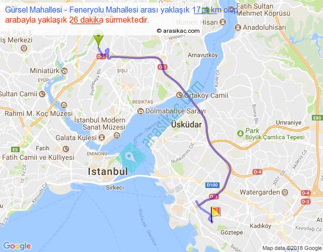 Eğer Gürsel Mahallesi Feneryolu Mahallesi arası ne kadar yakar (benzin/mazot) diyorsanız, kilometrede 3 ₺ yakan bir aracınız var ise 51, km'de 4 ₺ yakan bir aracınız var ise 68, km'de 5 ₺ yakan bir aracınız var ise 85 ile bu yolculuğu tamamlayabilirsiniz.