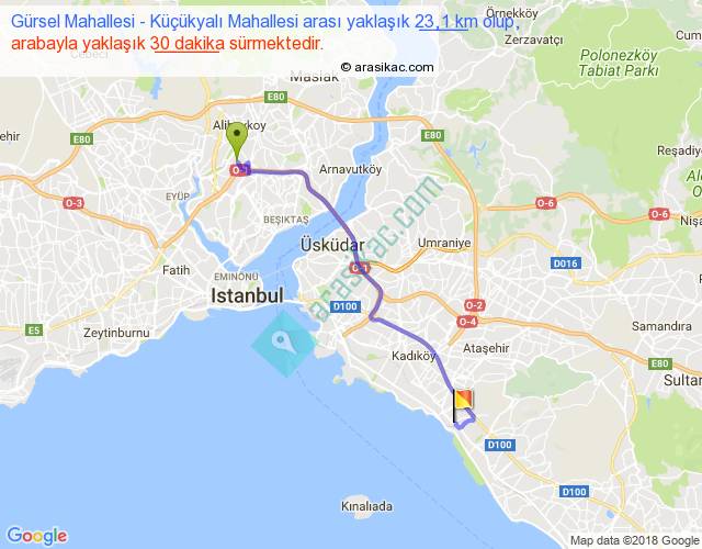 Gürsel Mahallesi - Küçükyalı Mahallesi arası yaklaşık olarak 90 km/h ile yukarıda belirtilen sürede olup, iki yerin kuş uçuşu uzaklığı (mesafesi) 18'dir. Yolculuk otobüsle 39 dakika sürmektedir.