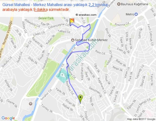 Gürsel Mahallesi - Merkez Mahallesi arası yaklaşık olarak 90 km/h ile yukarıda belirtilen sürede olup, iki yerin kuş uçuşu uzaklığı (mesafesi) 1'dir. Yolculuk otobüsle 11 dakika sürmektedir.