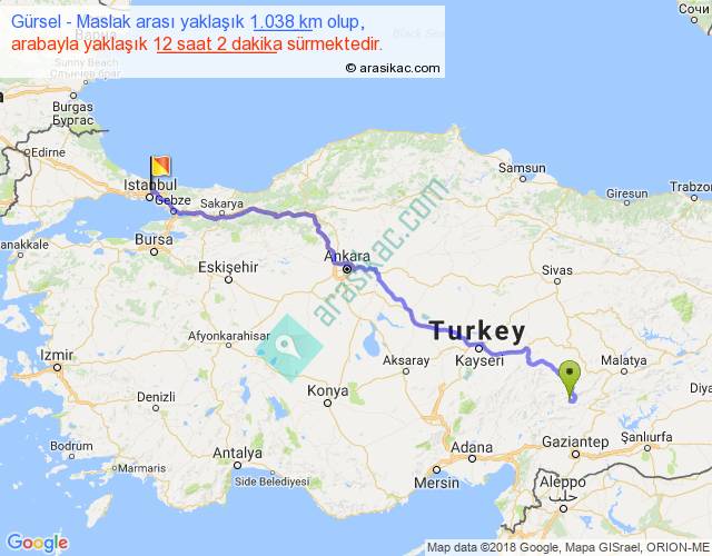Gürsel - Maslak arası yaklaşık olarak 90 km/h ile yukarıda belirtilen sürede olup, iki yerin kuş uçuşu uzaklığı (mesafesi) 787'dir. Eğer belirtilen yerler arasında uçak seferi var ise bu süre uçakla 1 saat 12 dakika'ya kadar düşebilir. Yolculuk otobüsle 15 saat 38 dakika sürmektedir.