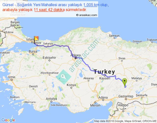Gürsel - Soğanlık Yeni Mahallesi arası yaklaşık olarak 90 km/h ile yukarıda belirtilen sürede olup, iki yerin kuş uçuşu uzaklığı (mesafesi) 765'dir. Eğer belirtilen yerler arasında uçak seferi var ise bu süre uçakla 1 saat 10 dakika'ya kadar düşebilir. Yolculuk otobüsle 15 saat 12 dakika sürmektedir.