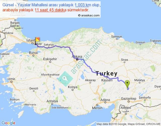 Gürsel - Yayalar Mahallesi arası yaklaşık olarak 90 km/h ile yukarıda belirtilen sürede olup, iki yerin kuş uçuşu uzaklığı (mesafesi) 759'dir. Eğer belirtilen yerler arasında uçak seferi var ise bu süre uçakla 1 saat 10 dakika'ya kadar düşebilir. Yolculuk otobüsle 15 saat 16 dakika sürmektedir.