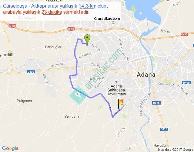 Gürselpaşa - Akkapı arası yaklaşık olarak 90 km/h ile yukarıda belirtilen sürede olup, iki yerin kuş uçuşu uzaklığı (mesafesi) 7'dir. Yolculuk otobüsle 29 dakika sürmektedir.