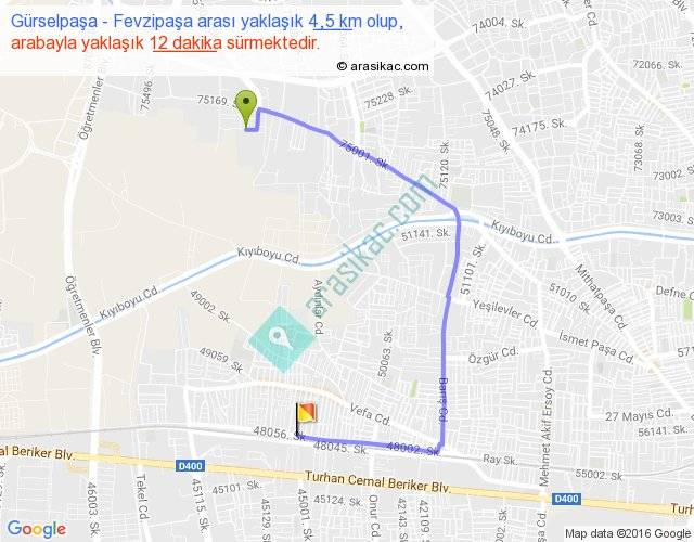 Eğer Gürselpaşa Fevzipaşa arası ne kadar yakar (benzin/mazot) diyorsanız, kilometrede 3 ₺ yakan bir aracınız var ise 12, km'de 4 ₺ yakan bir aracınız var ise 16, km'de 5 ₺ yakan bir aracınız var ise 20 ile bu yolculuğu tamamlayabilirsiniz.
