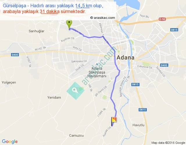 Gürselpaşa - Hadırlı arası yaklaşık olarak 90 km/h ile yukarıda belirtilen sürede olup, iki yerin kuş uçuşu uzaklığı (mesafesi) 11'dir. Yolculuk otobüsle 40 dakika sürmektedir.