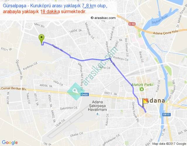 Gürselpaşa - Kuruköprü arası yaklaşık olarak 90 km/h ile yukarıda belirtilen sürede olup, iki yerin kuş uçuşu uzaklığı (mesafesi) 6'dir. Yolculuk otobüsle 23 dakika sürmektedir.