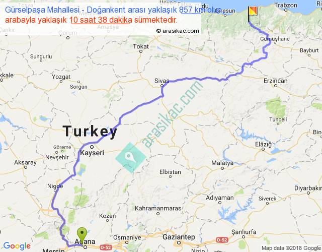 Gürselpaşa Mahallesi - Doğankent arası yaklaşık olarak 90 km/h ile yukarıda belirtilen sürede olup, iki yerin kuş uçuşu uzaklığı (mesafesi) 524'dir. Eğer belirtilen yerler arasında uçak seferi var ise bu süre uçakla 48 dakika'ya kadar düşebilir. Yolculuk otobüsle 13 saat 49 dakika sürmektedir.