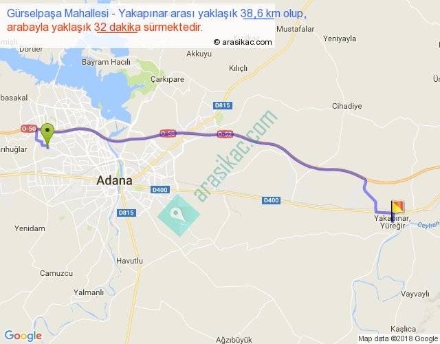 Gürselpaşa Mahallesi - Yakapınar arası yaklaşık olarak 90 km/h ile yukarıda belirtilen sürede olup, iki yerin kuş uçuşu uzaklığı (mesafesi) 31'dir. Yolculuk otobüsle 41 dakika sürmektedir.