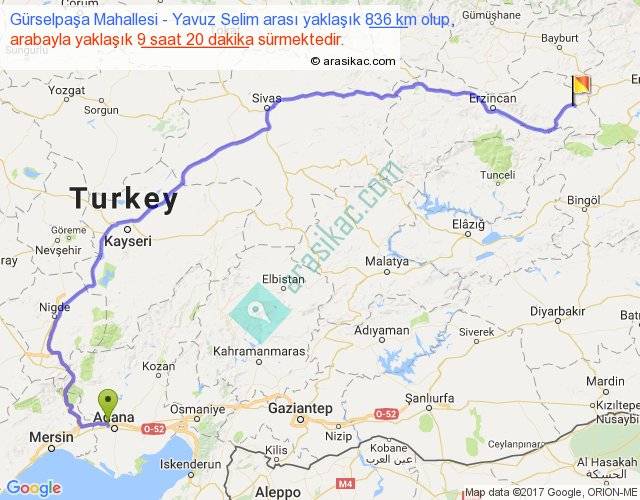 Gürselpaşa Mahallesi - Yavuz Selim arası yaklaşık olarak 90 km/h ile yukarıda belirtilen sürede olup, iki yerin kuş uçuşu uzaklığı (mesafesi) 538'dir. Eğer belirtilen yerler arasında uçak seferi var ise bu süre uçakla 49 dakika'ya kadar düşebilir. Yolculuk otobüsle 12 saat 8 dakika sürmektedir.