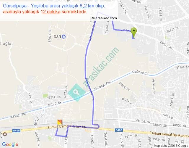 Gürselpaşa - Yeşiloba arası yaklaşık olarak 90 km/h ile yukarıda belirtilen sürede olup, iki yerin kuş uçuşu uzaklığı (mesafesi) 3'dir. Yolculuk otobüsle 15 dakika sürmektedir.