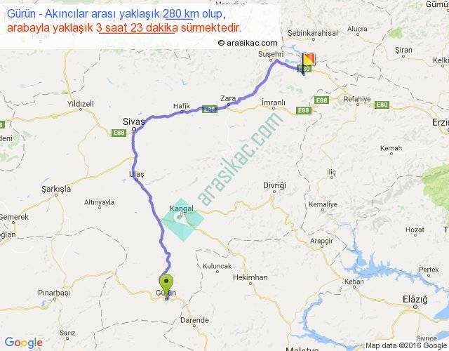 Gürün - Akıncılar arası yaklaşık olarak 90 km/h ile yukarıda belirtilen sürede olup, iki yerin kuş uçuşu uzaklığı (mesafesi) 176'dir. Yolculuk otobüsle 4 saat 23 dakika sürmektedir.