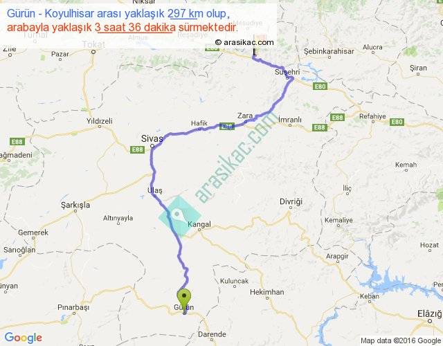 Gürün - Koyulhisar arası yaklaşık olarak 90 km/h ile yukarıda belirtilen sürede olup, iki yerin kuş uçuşu uzaklığı (mesafesi) 181'dir. Yolculuk otobüsle 4 saat 40 dakika sürmektedir.